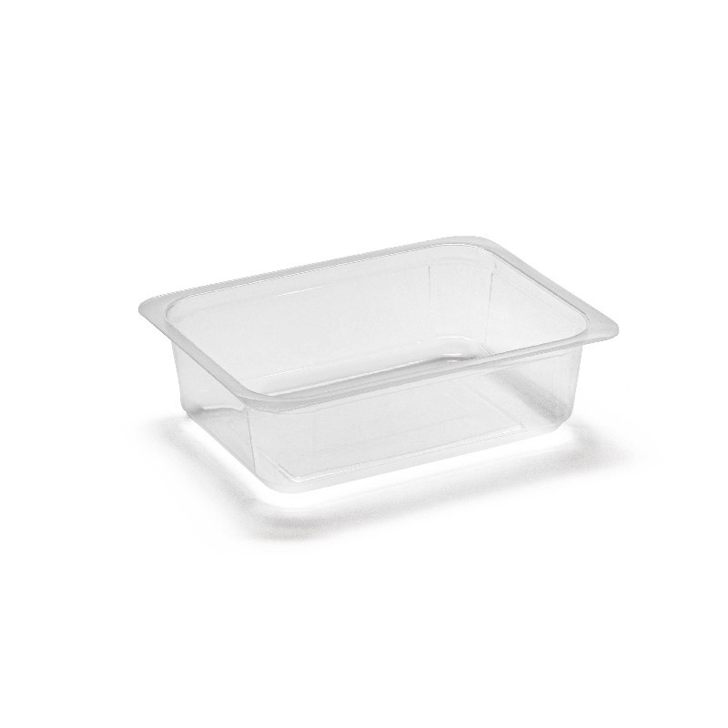 Vaschette termosaldabili per alimenti in PP, formato 1/8 Gastronorm H40, ideali per conservazione e porzionatura di preparazioni fresche. Resistenti, leggere e idonee a cibi caldi e freddi.