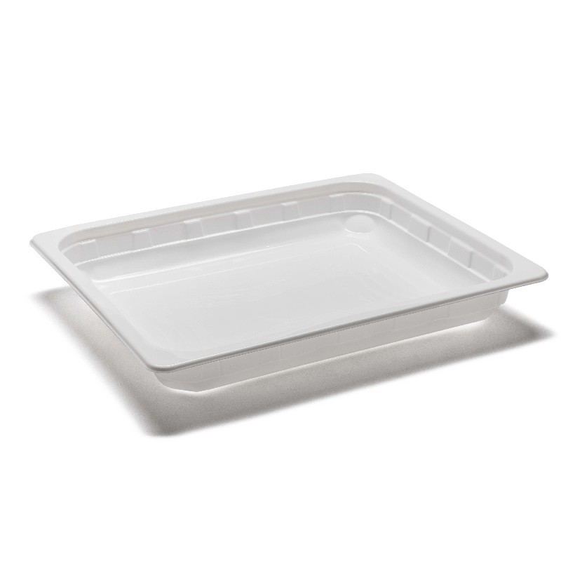 Vaschette termosaldabili per alimenti in PP formato 1/2 Gastronorm H40, ideali per confezionamento, conservazione e trasporto di preparazioni alimentari. Resistenti, igieniche e adatte a cibi caldi e freddi.