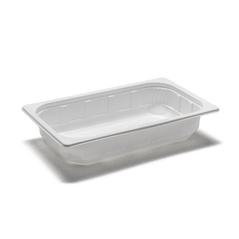 Vaschette termosaldabili per alimenti in PP formato 1/4 Gastronorm, altezza 42 mm. Resistenti, igieniche e idonee alla conservazione di cibi caldi e freddi.